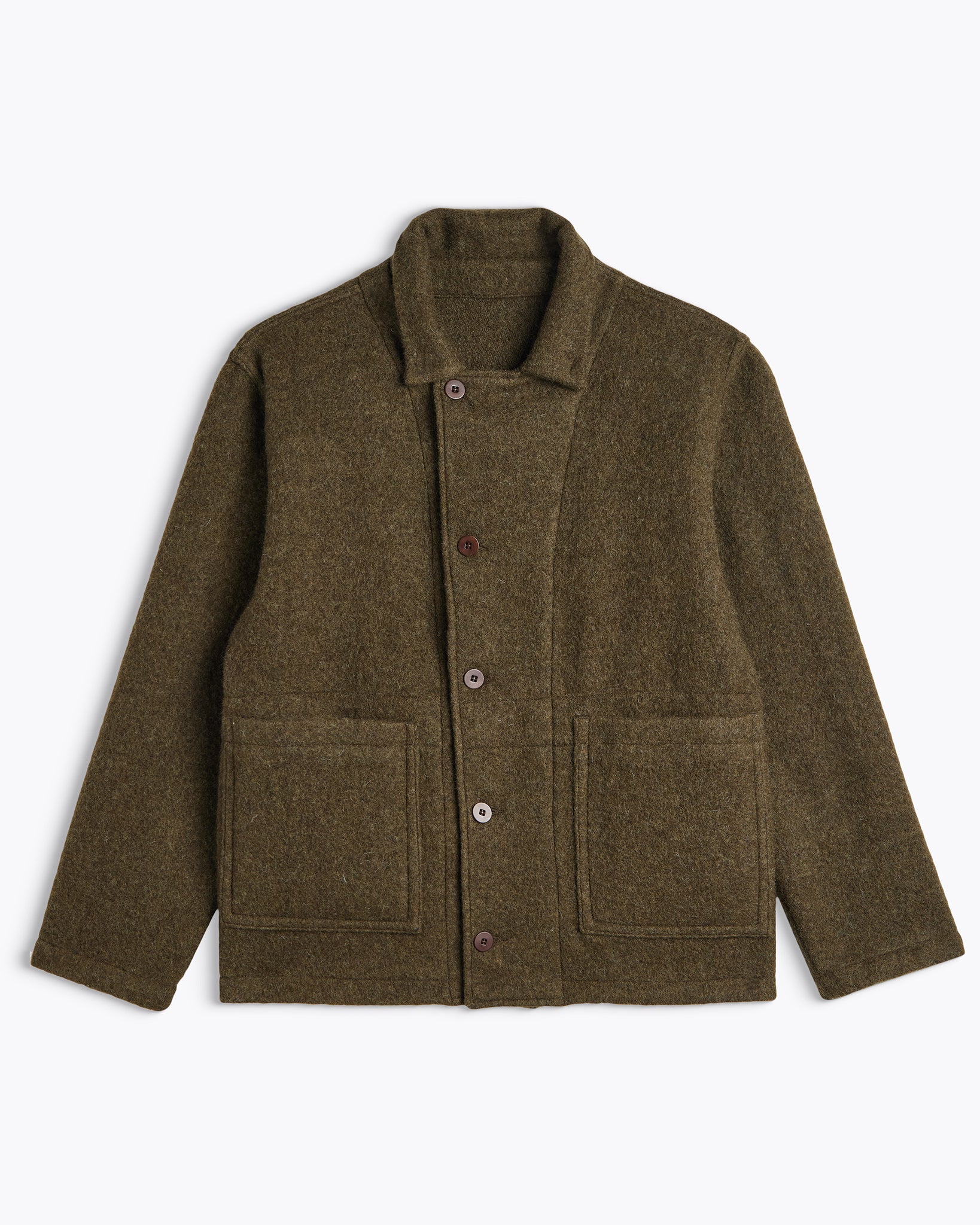 La veste Swit Sheep Greenery par Homecore incarne un équilibre élégant entre esthétique fonctionnelle et conscience durable. Conçue dans une laine vierge, elle se distingue par sa coupe droite réversible et un jeu subtil de contrastes entre intérieur et extérieur, apportant sophistication et polyvalence à la pièce.
